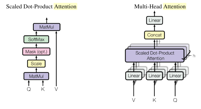 如上图2左边所示即为dot-producted attention的一般形式,在transformer中,初始Q, K, V即为一个句子所有的subword编码构成的矩阵(seq_len, d_model),其中d_model是subword的编码长度。Deocder的第二个Multi-Head Attention中的Q, K, V会有所不同,在讲解Multi-Head Attention是提到。下面是dot-producted attention的数学表达形式
